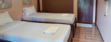 Guests can choose from single-bed rooms, twin rooms, and compact villas. Each unit is furnished in a simple, clean style, ideal for short stays.