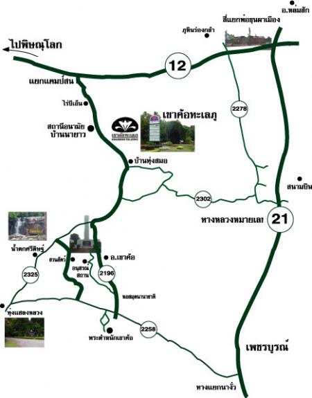 2. Another route from Bangkok is to take Route 1 Phahonyothin Road to Wang Noi. At Wang Noi, take Route 32 and drive through Ayutthaya Province, Ang Thong Province, Singburi Province, and Chainat Province until you arrive in Nakhon Sawan. From there, take Route 117 to Phitsanulok, and then Route 12 (Phitsanulok-Lom Sak). At Kilometer Post 100 on Route 12 (Ban Camp Son), turn right onto Route 2196 and drive toward Khaokho. Khaokho Talaypu is about 5.5 km from the Camp Son Intersection. It is 500 m. past Wat Ban Na Yao, on the left side of road, opposite the Ban Na Yao Health Station. The total driving time is about seven hours.