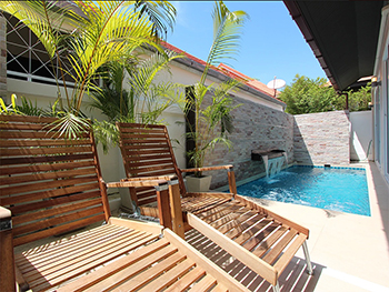 Villa De Bocara Pattaya is located at Pattaya Villa Deluxe, 2 bedrooms, 2 bathrooms, located in The Village, Jomtien, Banglamung, private pool villa with BBQ stove and kitchen.