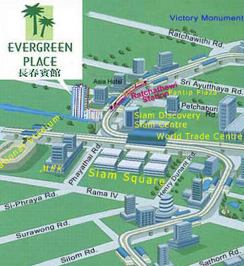 Evergreen Place Apartment is situated at the heart of Bangkok on Phayathai road, Evergreen is just minutes away from major shopping and entertainment centers; MBK, Siam Square, Siam Discovery Centre, and Movie Complex. Close by is the National Sports Stadium. For working residents, the sky train is just a few steps away. The twenty three floors of Evergreen serviced apartment has been built to the highest international standards and offers one and two bedroom suites of five different sizes from 44 to 88 square meters. each is fully furnished and equipped with a complete range of modern amenities. At Evergreen, you not only enjoy a world of comfort and convenience, but also a safe and sound way of life. We offer Ving Card security system, Glunz-floor panel for health purpose, Silarhart LD - hot water, and energy saving key tag. Map