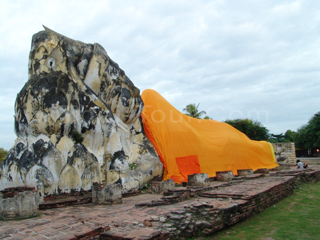 พระบาทซ้อนกันเป็นมุมฉาก นิ้วพระบาทยาวเท่ากัน มีความยาว ๔๒ เมตร และสูง ๘