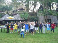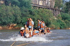 วันแรก : สวนไทรโยค เที่ยวสะพานถ้ำกระแซ ล่องแพเปียก เล่นน้ำแม่น้ำแควน้อย แคมป์ไฟชมพลุตระการตา คาราโอเกะ ดิสโก้เธค ชมถ้ำเชลย