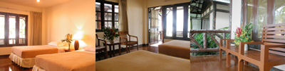 Type A บังกะโล 2 ห้องนอน 1 ห้องนํ้า 1 ห้องรับแขก (เสริมที่นอนได้) มีระเบียงหน้าบ้านขนาด 3x6 เมตร ตกแต่งภายในสวยงาม พร้อมด้วย อุปกรณ์อำนวยความสะดวก TV ,Air-Conditioner ,Refrigerator , UBC.