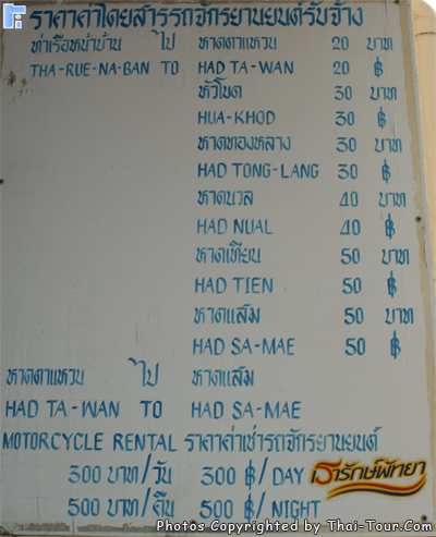 เช่ารถมอเตอร์ไซค์บนเกาะ ติดต่อขอเช่าได้จากคนขับมอเตอร์ไซค์รับจ้าง ราคา 300 บาท/วัน แล้วแต่ต่อรอง ข้อควรระวังคือเส้นทางส่วนใหญ่เป็นทางขึ้นเขาชันมาก ทางจะลื่น ไม่เหมาะสำหรับผู้ที่ขับมอเตอร์ไซค์ไม่ชำนาญ