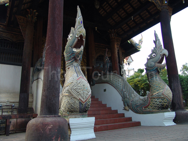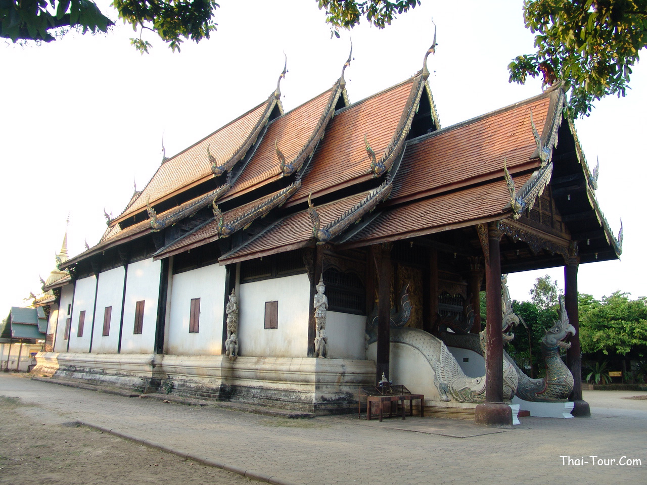 หลังคาวิหารเป็นหลังคาซ้อนกัน 3 ชั้น ประดับด้วยกระเบื้องดินเผา มีช่อฟ้าและหางหงส์ เป็นรูปนาคตามคติชาวล้านนาที่เชื่อว่า วิหารเปรียบเสมือนเขาพระสุเมรุ ต้องมีนาคคอยดูแลอยู่ จึงมีการประดับตกแต่งวารด้วยนาค ส่วนลานทรายที่อยู่รายรอบวิหารหรือศาสนสถานอื่น ๆ ของล้านนาเปรียบเสมือนว่าเป็นน้ำหรือนทีสมุทร ดังนั้นจะเห็นว่า ทางเข้าด้านหน้าวิหารทำเป็นราวบันไดรูปมกรคายนาคด้วยและนาคที่นี่ก็มีลักษณะพิเศษเฉพาะตัวคือ เป็นนาคปากนกแก้วซึ่งมีเพียงแห่งเดียว ส่วนมุขโถงด้านหน้าวิหารเป็นการสร้างขึ้นมาใหม่ในสมัยที่มีการบูรณะ