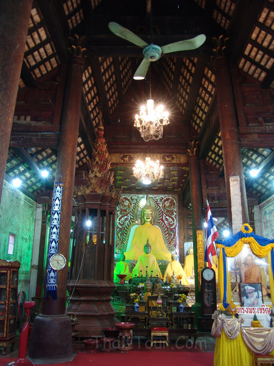 จากแผนผังวิหารแห่งนี้จะเห็นได้ว่าเป็นรูปสี่เหลี่ยมผืนผ้า ด้านหน้าและด้านหลังมีการลดขนาดความกว้างของห้องเป็น 3 ช่วง เพื่อให้สอดคล้องกับชั้นลดของหลังคา ด้านหลังทำเป็นฐานชุกชีไว้ประดิษฐานพระประธาน และพระพุทธรูป ด้านข้างเป็นที่ตั้งธรรมาสน์คาดว่าจะสร้างขึ้นพร้อมกับการสร้างวิหาร ธรรมาสน์มีลักษณะเฉพาะตามแบบล้านนา เป็นรูปทรงปราสาท ประดับตกแต่งด้วยลายพันธุ์พฤกษา และยังมีสิ่งที่ถือว่าเป็นองค์ประกอบสำคัญอย่างหนึ่งที่จะพบได้ในวิหารล้านนาทั่วไปคือ สัตตภัณฑ์ อันเป็นเครื่องสักการบูชาภูเขาทั้ง 14 ในไตรภูมิตามความเชื่อของชาวล้านนา จะใช้กันในวันพระหรือวันสำคัญทางศาสนาโดยชาวบ้านจะนำเทียนมาจุดบนสัตตภัณฑ์นี้ มีลักษณะสามเหลี่ยมหน้าจั่ว ตรงกลางทำเป็นรูปเทพพนมและมีลายพันธุ์พฤกษา ด้านหลังรูปเทพพนมประดับแก้วอังวะ (กระจกจีน) ด้านข้างทำเป็นรูปมกรคายนาค สัตตภัณฑ์นี้จะตั้งอยู่ด้านหน้าพระประธานอีกทีหนึ่ง