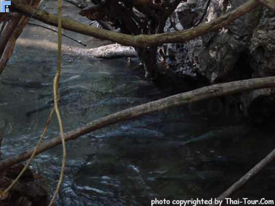 ภายในแอ่งน้ำมีน้ำไหลออกจากถ้ำใต้ภูเขาอยู่ตลอดเวลา และมีปลาตัวโตๆ