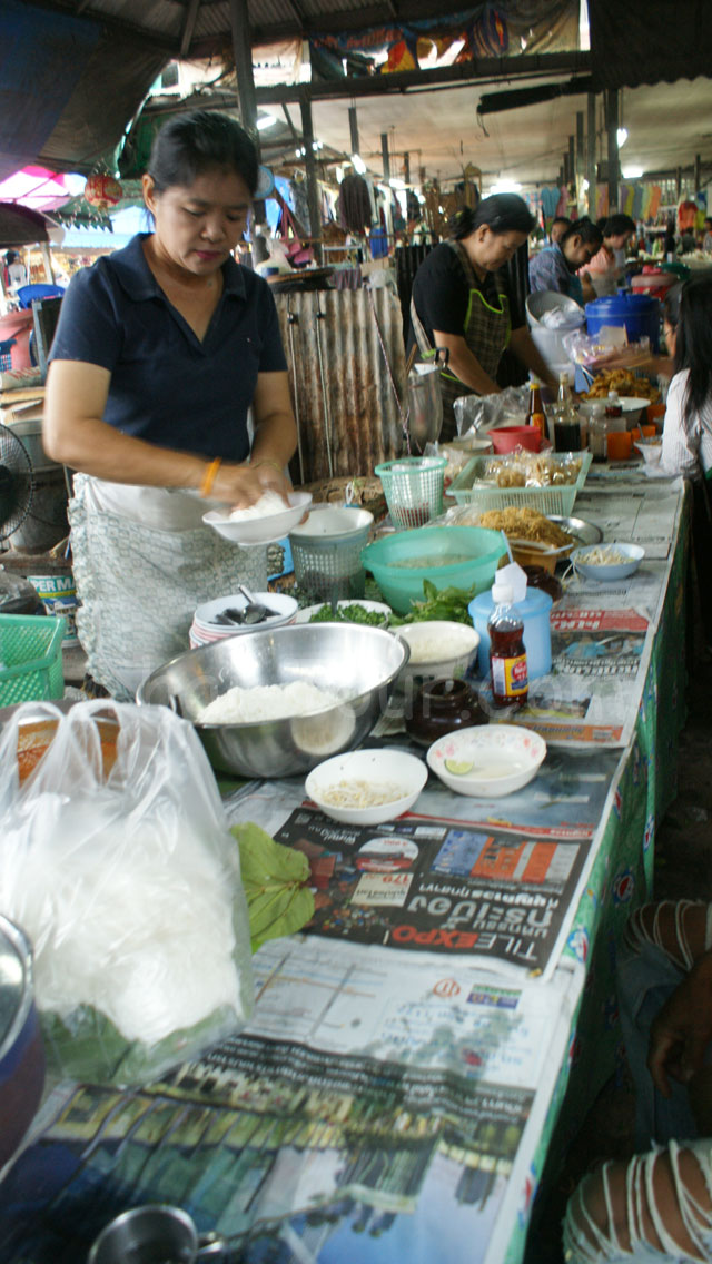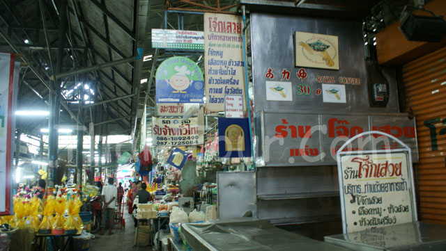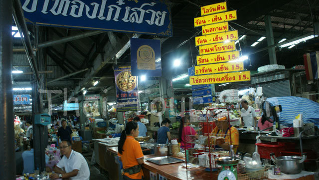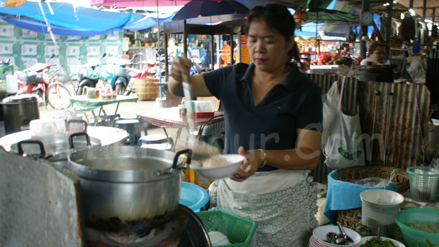 มีอาหารเช้าให้นักท่องเที่ยวหรือผู้คนในละแวกนั้นได้ทาน คือ โจ๊กเสวยอันลือลั่น แต่คนแน่นมาก ถ้าไม่อยากรอนานก็แนะนำให้ไปทาน กาแฟ-ปาท่องโก๋ หรือจะเป็นต้มเลือดหมูที่ร้านแถว ๆ นั้นก็ได้ ตลาดสายหยุดนี้ อยู่ข้างสนามบินประจำจังหวัด ตรงนี้คือด้านหน้าตลาด ด้านหลังตลาดก็จะเป็นธนาคารกรุงไทย ธนาคารอยู่ปากซอยในซอยจะมีร้านขาย ต้มเลือดหมู ก๋วยจั๊บ ก๋วยเตี๋ยว ท้ายซอยก็คือหลังตลาด มีร้านกาแฟ ปาท่องโก๋ ข้าวเหนียว หมูทอด ปลาทอด ไก่ทอด เดินเข้าไปก็จะเห็นร้านโจ๊ก แต่จะถามว่าอร่อยหรือไม่นั้น ก็ลองถามคนในละแวกนั้นจะดีกว่า เพราะว่าคนรอคิวเยอะมาก