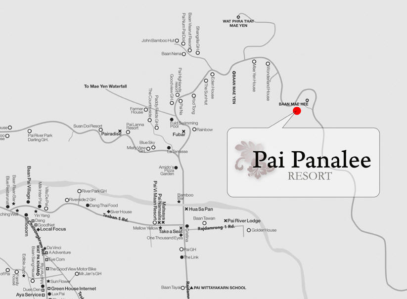 Huean Pai New! Pai Hotspring, Rim Pai Cottage, Huting Pai, Baan Krating, Pai River Mountain, Muang Pai, Bulun Buri Pai, Baan Pai Village, Belle Villa Pai, The Quarter, Pai Vimaan, Cafe Del Doi, Pai Herb Resort, Pai River Villa, Pura Vida, Vimarnkiri Resort, Phu Pai Art Resort, Pai Praya Resort, Pai Tara Resort New!, Pai Baanthai Resort & Spa New!, Bura Lumpai Resort New!, Pai Tree House, Yoma Hotel New!,  Paicome Hide Away, @pai Resort New!, Pai Panalee new! , Baan Chokdee Pai New! , Pai Country Home New!, Montis Resort New!, Pai Klang Doi New!, Baantawan Pai New!, Him Naam Pai New!, Huean Muang Pai New!, Pai Kiang Duan New!, Baan Pasuk New!, Puan Pai View New!, Pai Iyara New!, Pai Island, Pripta Resort New!, Pai Vieng Fah New!, Baan Suan Rim Pai, Baan Kung Kang de Pai New!, Pai Nai Fun New!, Pai Flora Resort, Baan Pai Roong New!, Hotel des Artists New!, Pai Chumyen New!, Ban Mintra New!,  Yudee Kindee Pai New!, The Heart of Pai New!, Pai River Curve New!, The Oia Pai