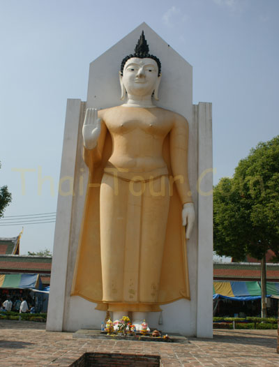เป็นพระพุทธรูปยืนปางห้ามญาติด้านหลังพระวิหาร สูง 18 ศอก