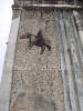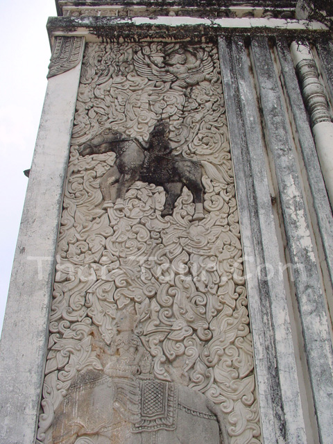 เหนือซุ้มประตูมีทับหลังเป็นปูนปั้นลายดอกบัวบาน รูปบุคคล และสัตว์ต่าง