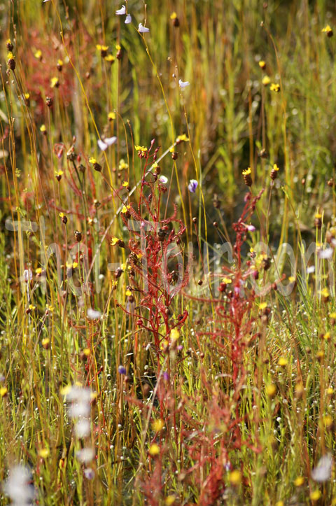 ใบ : ใบรูปเส้นยาวเรียวค่อนข้างอวยหนายาว 2 - 7 ซม. ปลาย ม้วนงอ เป็นวงมีขนสีแดงทั่วใบปลาย ขนมีต่อมน้ำในเหนียวไว้ดักจับแมลงเป็นอาหาร ดอก : ดอกเป็นช่อที่ปลายกิ่งสีชมพูม่วง ขนาดดอก 0.5 - 1 ซม. ดอกบานในต้อนเช้าเมื่อได้รับแดดอ่อนและหุบในตอนบ่าย