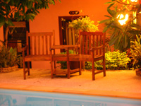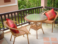 Located on the ground floor of the 2-storey building with private balconies overlooking poor and garden view with dinning table.