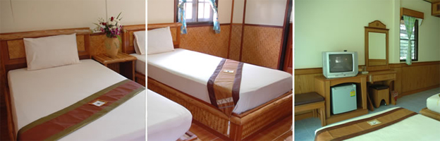 The room size is large enough which can add another extra bed comfortably. The whole room furnished with wooden furniture as wardrobe, dressing table and shelf. For truly convenience, the full facilities were added with satellite TV, mini bar, fridge and wall fan.