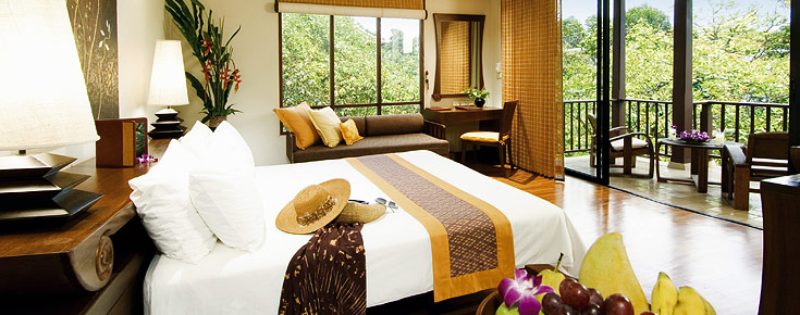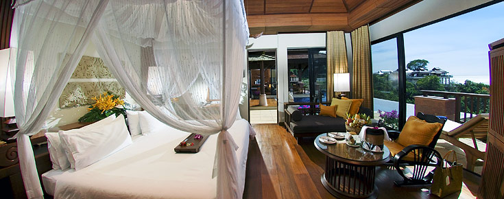 feature a polished teak wood floor, rattan curtains, rich Thai fabric
