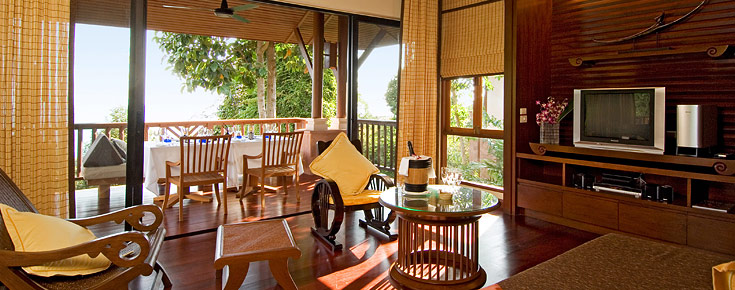 living space with polished teak wood floor, rich Thai cotton upholstery,