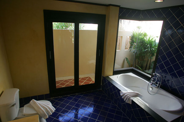 with bathtub and extra outdoor shower, hot/cold water, international