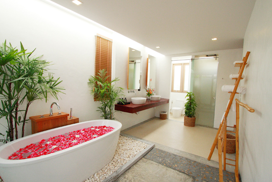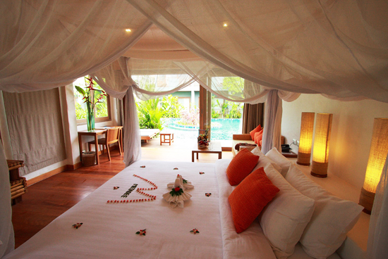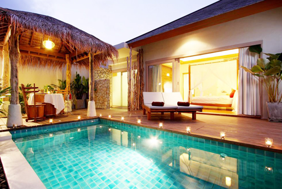 private plunge pool and a sala (an outdoor living area with a thatched roof)