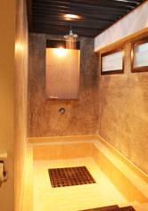 shower and built-in bath with skylight, and hot water supply.