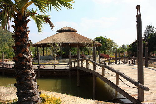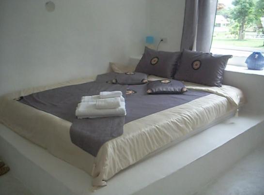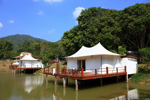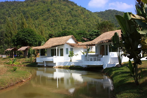 นอกจากบ้านพักสไตส์เต้นท์แล้วยังมีบ้านปูนสีขาวหลังคาหญ้าคาที่ตัดกับต้นไม้สีเขียว