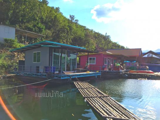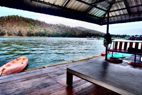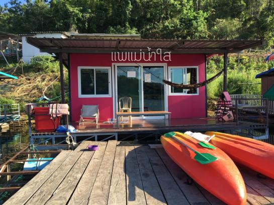 แพพัก ลอยน้ำ เหนือเขื่อนศรีนครินทร์ แพพักอยู่กับที่ มีเรือคายัคให้พาย บริการพาล่องแพเปียกชมวิวยามเย็น