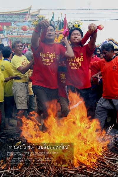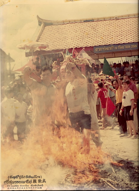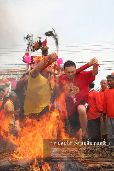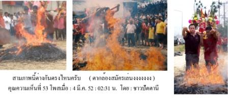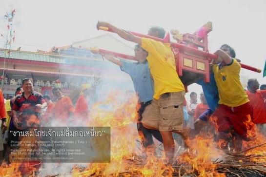 ก่อนที่จะทำการลุยไฟองค์พระทุกองค์ต้องวนรอบกองไฟ3รอบก่อนที่จะทำการลุยไฟรูปนี้เป็นรูปเจ้าแม่กำลังเดินวนรอบกองไฟ