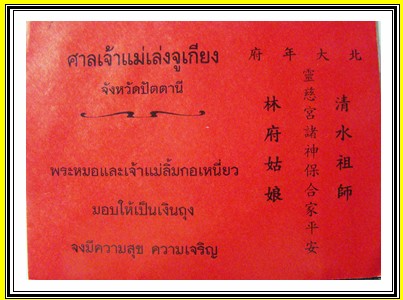 วันหลังจะเอาเรื่องฮู้หรือผ้ายันต์ของศาลเจ้าแม่ลิ้มกอเหนียว จังหวัดปัตตานีมาเล่าให้ฟังถึ่งที่มาที่ไปน่ะครับ เพราะว่ามีคนนำฮู้ของศาลเจ้าแม่ลิ้มกอเหนียวจังหวัดปัตตานีมาจำหน่าย โดยที่ศาลเจ้าแม่ลิ้มกอเหนียวไม่ได้รู้เห็นเป็นใจด้วยเลยหวังว่าคงรู้ตัวน่ะครับ