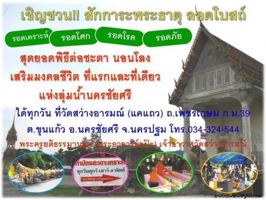 เชิญชวน!! สักการะพระธาตุ ลอดโบสถ์ สุดยอดพิธีต่อชะตานอนโลง เสริมมงคลชีวิต ที่แรกและที่เดียวแห่งลุ่มน้ำนครชัยศรี ได้ทุกวันที่ วัดสว่างอารมณ์ (แคแถว) ต.ขุนแก้ว อ.นครชัยศรี จ.นครปฐม โทร.034-324-544