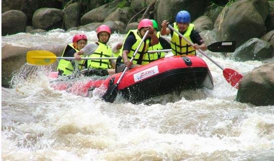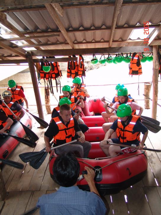 เราจะออกรับท่านแต่เช้าเพื่อเดินทางผ่านอ.แม่ริม สู่อ.แม่แตง จนถึงบ้านสบก๋าย จุดเริ่มล่องแก่งของสายน้ำแตงอันเลื่องชื่อ รับประทานอาหารกลางวัน เมื่ออิ่มท้องกันแล้ว เริ่มซักซ้อม ใส่หมวกและเสื้อชูชีพนิรภัย เรียนรู้เทคนิคการพาย และการปฏิบัติตัวเมื่อพลาดตกลงไปในน้ำ เหล่าทีมงาน Rescue จะเข้าช่วยทันที ข้อดีที่สุดของสายน้ำแตงคือ ความกว้างของสายน้ำนี้ประมาณ 5-20 เมตร ไม่กว้างเกินไปและทีม Rescue จะเข้าถึงตัวเมื่อเกิดการตกเรือ เราเน้นถึงความปลอดภัยของท่านเป็นข้อสำคัญสูงสุด เมื่อพวกเราพร้อมก็เริ่มล่องแก่งกันช่วงระยะ 500 เมตรแรกเป็นช่วงแก่งเล็กๆ ชื่อว่า Easy Going ให้เราได้ฝึกซ้อม นำทฤษฏีที่ได้เรียนมาปฏิบัติจริง โดยมี Captain ที่มีความชำนาญสูงเป็นผู้คุมบังเหียนแพยางของเรา