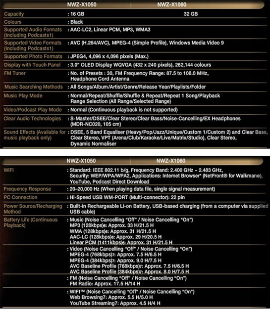 ข้อมูลจำเพาะของ Walkman X1000 Series