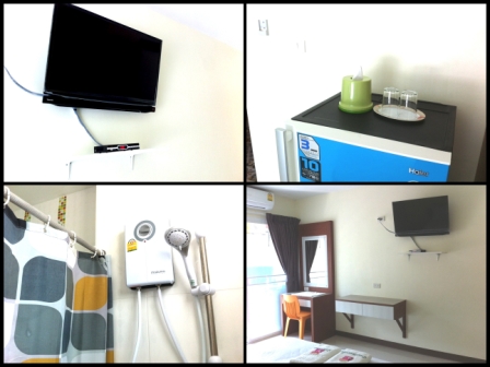 ภายในห้องพักกว้างขวาง ขนาด 4x7.5 เมตร เตียง 6 ฟุต ตู้เสื้อผ้าขนาดใหญ่ ชั้นวางของ โต๊ะขนาดใหญ่ โต๊ะขนาดเล็ก เครื่องทำน้ำอุ่น เคเบิลทีวี ตู้เย็น บริการอินเตอร์เน็ตเล่นฟรีสำหรับผู้พัก
