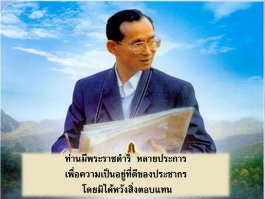 พระบาทสมเด็จพระเจ้าอยู่หัว ทรงทุ่มเทพระวรกายตรากตร่ำและมุ่งมั่น เพื่อแก้ไขปัญหาความเดือดร้อนให้แก่พสกนิกร ไม่ว่าจะเชื้อชาติใด ศาสนาใด หรืออยู่ห่างไกลกันสักเพียงใด ก็มิทรงย่อท้อ เข้าไปช่วยเหลือราษฎรทั้งด้านสาธารณสุข การศึกษา สาธารณูปโภคขั้นพื้นฐาน การเกษตร การฟื้นฟูทรัพยากรธรรมชาติ และสิ่งแวดล้อมทั้งดิน น้ำ ป่าไม้ และพลังงาน หรือแม้กระทั่งการจราจร ทรงคิดค้นแนวทางแก้ไขได้อย่างแยบยล
