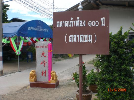 รูปป้ายตลาดเก้าห้อง 100 ปี (ตลาดบน) และ ป้ายเสาหินภาษาจีน ตลาดเก้าห้อง