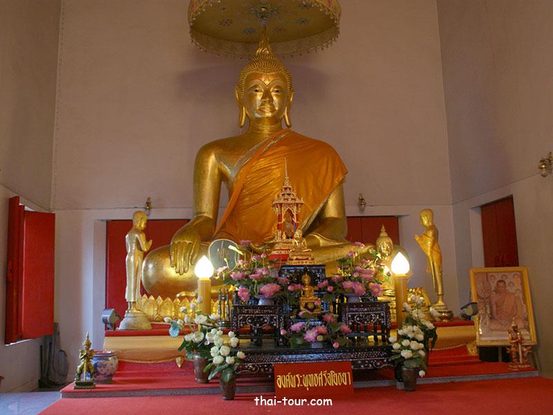 พระประธานในอุโบสถ หล่อด้วยทองสัมฤทธิ์ทรงเครื่องแบบกษัตราธิราช นมัสการพระพุทธนิมิตวิชิตมารโมลีศรีสรรเพชญ์บรมไตรโลกนาถ ตั้งอยู่ริมคลองสระบัวด้านทิศเหนือของคูเมือง (เดิมเป็นแม่น้ำลพบุรี) ตรงข้ามกับพระราชวังหลวง