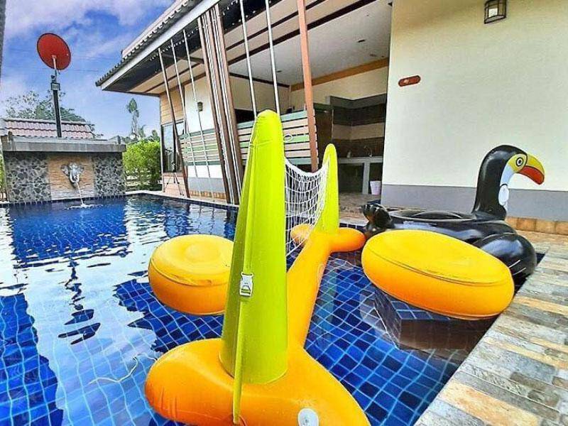 บ้านพักสระว่ายน้ำส่วนตัว ห้องนั่งเล่น 1 ห้อง ห้องครัวสไตล์ยุโรป 1 ห้อง มีแอร์ทั้งหลัง ห้องครัวมีอุปกรณ์เครื่องครัวครบครัน เตาปิ้งย่าง พร้อมมีอินเตอร์เน็ตไร้สายทั่วทั้งหลัง พร้อมที่นั่งเล่นข้างสระ มากับสวนหย่อมเล็กๆ พักได้ 12 คน คุ้มค่ากับการพักผ่อน และที่จอดรถส่วนตัว