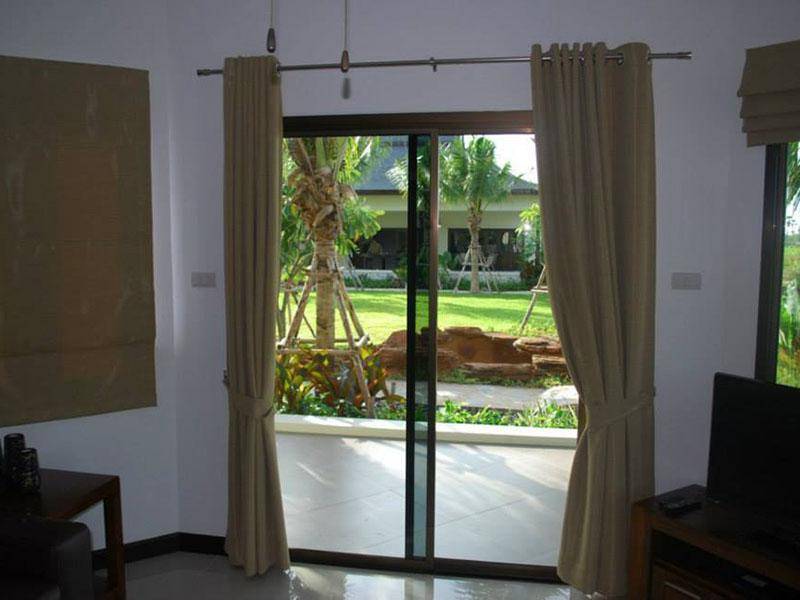 ห้องพักสไตล์โมเดิร์น เปิดโล่ง รับแสงธรรมชาติ มีทีวี LG, เครื่องเล่น DVD โต๊ะกาแฟ ห้องนั่งเล่นมุมส่วนหัวเห็นวิวสระ