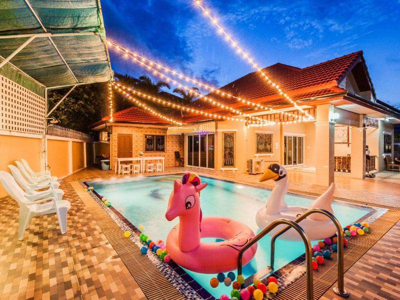 บ้านพักพัทยา แนะนำบ้านพักพักพัทยาพร้อมสระว่ายน้ำส่วนตัว ที่สามารถเข้าพักได้ 14 คน มีสิ่งอำนวยความสะดวกมากมาย ทั้งการติดตั้งเครื่องปรับอากาศทั้งหลัง อ่างอาบน้ำ ทีวีจอแบน ชุดเครื่องเสียงคาราโอเกะ ห้องครัว อุปกรณ์เครื่องครัวสำหรับทำอาหารด้วยตนเอง และเตาปิ้งย่างริมสระว่ายน้ำ