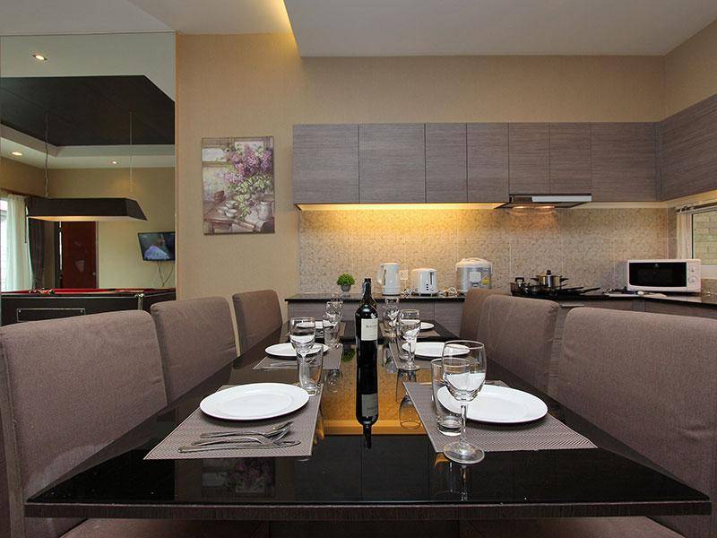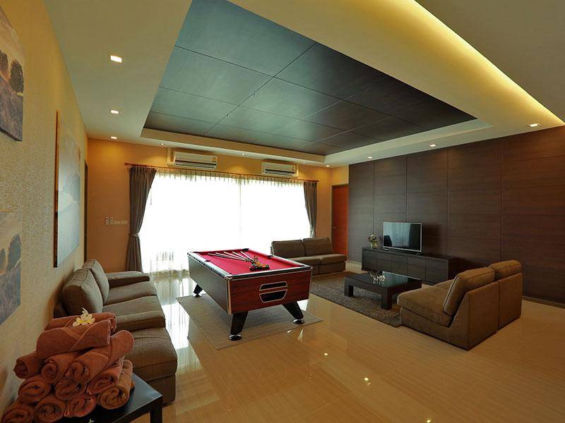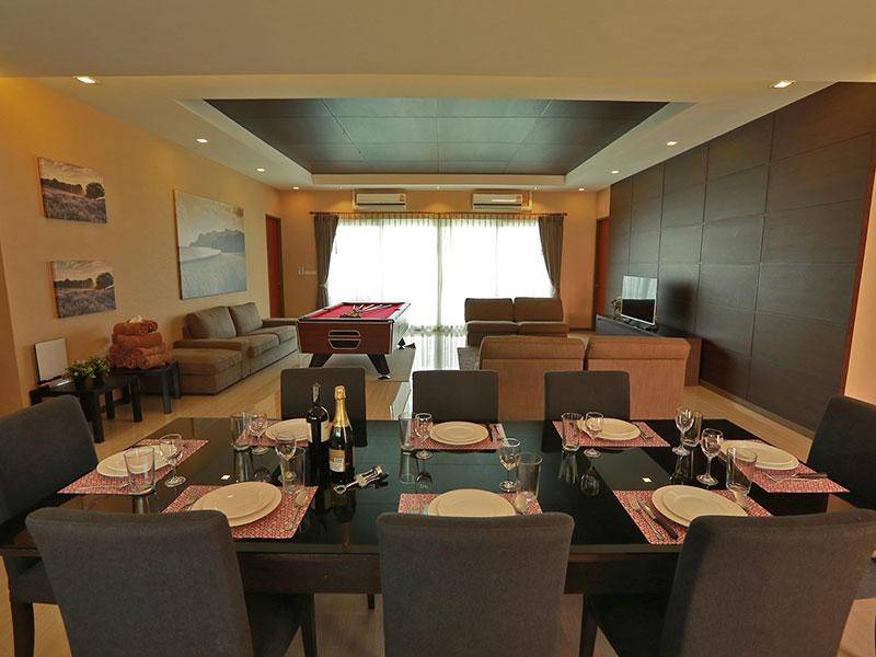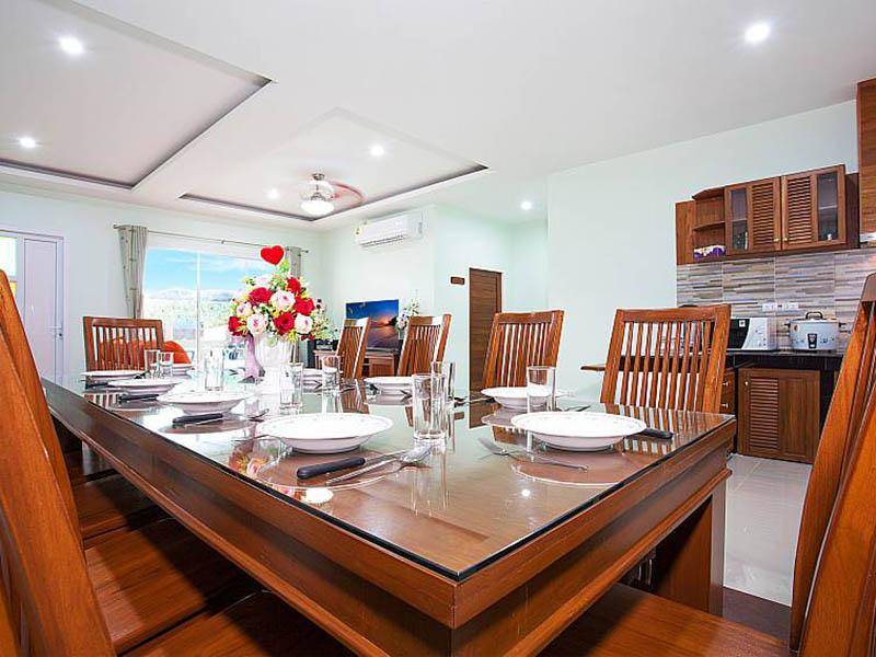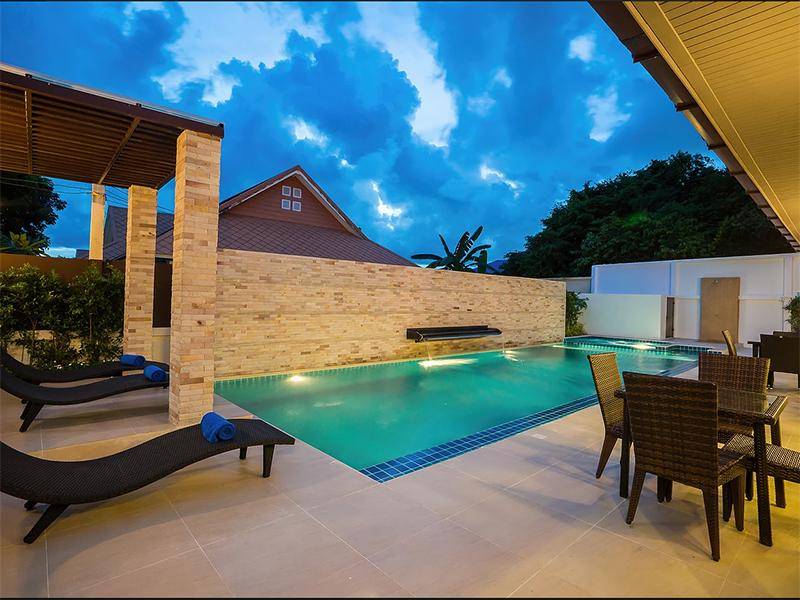 วิลล่า 6 ห้องนอนพร้อมสระว่ายน้ำ พร้อมสิ่งอำนวยความสะดวกครบครัน มีห้องนั่งเล่น, ห้องรับประทานอาหาร, 2 ห้องครัวและห้องนั่งเล่นที่มีโต๊ะพูล มีสระว่ายน้ำระเบียงโต๊ะเก้าอี้และเตียงอาบแดดว่ายน้ำ เหมากับมาพักกับครอบครัวหรือกลุ่มเพื่อน สามารถพักได้ถึง 12 คน