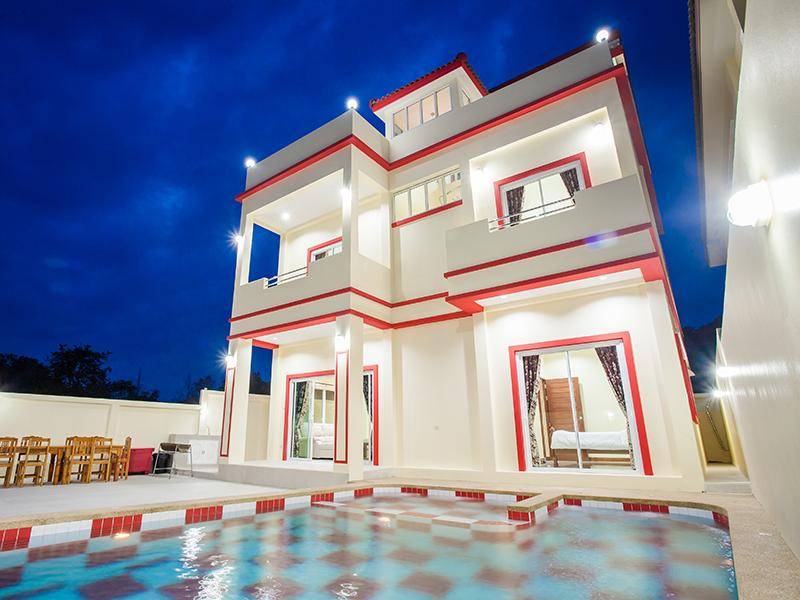 ที่พักเป็นบ้านชั้นเดียว มี 3 ห้องนอน 2 ห้องน้ำ ห้องพัก มีแอร์ ทีวี สระว่ายน้ำส่วนตัว ขนาด 6X3  สิ่งอำนวยความสะดวกอื่นๆ ได้แก่ คาราโอเกะ เตาปิ้งย่าง เตาแก๊ส(ด้านนอก) ห้องครัวสำเร็จรูป 2 ห้อง พร้อมอุปกรณ์ทำครัว เช่น จาน ชาม แก้ว หม้อหุงข้าว กระดิกน้ำร้อน มีด เขียง ไมโครเวฟ เครื่องปิ้งขนมปัง ชุดถ้วยกาแฟ ซิงค์ล้างจาน ถังน้ำแข็งขนาดใหญ่ มีกาแฟ น้ำดื่ม ผ้าเช็ดตัว