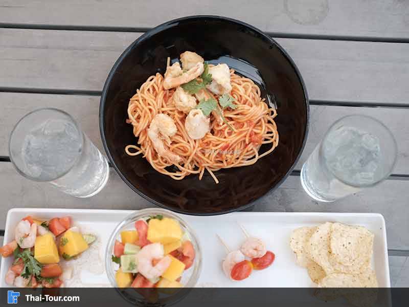 อาหารที่นี่ราคาไม่แพงมาก สั่งมา 2 จาน เพราะมา2 คน สปาเก็ตตี้ กุ้ง และ สลัดมะม่วง ค็อกเทลกุ้ง