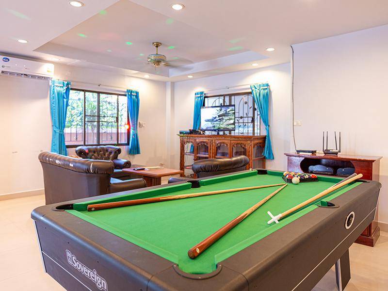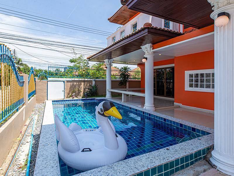 6.ฟันนี่ พูล วิลล่า พัทยา (Funny Pool Villa) 5 ห้องนอน ตั้งอยู่ท่ามกลางบรรยากาศย่านชานเมืองของพัทยา บริเวณสุขุมวิทนาจอมเทียน ใกล้แหล่งที่เที่ยว สไตล์ที่เป็นเอกลักษณ์เฉพาะตัวในแต่ละห้องนอน สามารถรองรับผู้อยู่อาศัยได้มากถึง 18 ท่าน สระว่ายน้ำขนาดใหญ่ เหมาะแก่การจัดปาร์ตี้สังสรรค