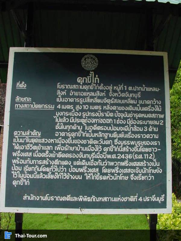 ตั้งอยู่ที่ตำบลปากน้ำแหลมสิงห์ ก่อนถึงท่าเทียบเรือ 1 กิโลเมตร สร้างขึ้นเมื่อ พ.ศ. 2436 (ร.ศ. 112)เมื่อฝรั่งเศสได้เข้ายึดจันทบุรี ในกรณีพิพาทกันด้วยเรื่องดินแดนฝั่งซ้ายแม่น้ำโขง ระหว่างนั้นกองทหารฝรั่งเศสประมาณ 600 คน แยกกันอยู่สองแห่ง แห่งแรกตั้งอยู่ที่เมืองจันทบุรี บริเวณที่เป็นค่ายทหารในปัจจุบัน อีกแห่งอยู่ที่ปากน้ำแหลมสิงห์ ฝรั่งเศสได้สร้างคุกขี้ไก่เพื่อใช้กักขังคนไทยที่ต่อต้านฝรั่งเศส มีลักษณะเป็นหอสี่เหลี่ยมจัตุรัสกว้างยาวด้านละประมาณ 4.40 เมตร สูงประมาณ 7 เมตร มีช่องระบายอากาศอยู่สองแถว หลังคาโปร่ง เล่ากันว่าเป็นคุกที่ทรมานมาก เพราะชั้นบนใช้เป็นที่เลี้ยงไก่ ซึ่งจะถ่ายมูลราดศีรษะนักโทษที่ถูกคุมขังตลอดเวลา