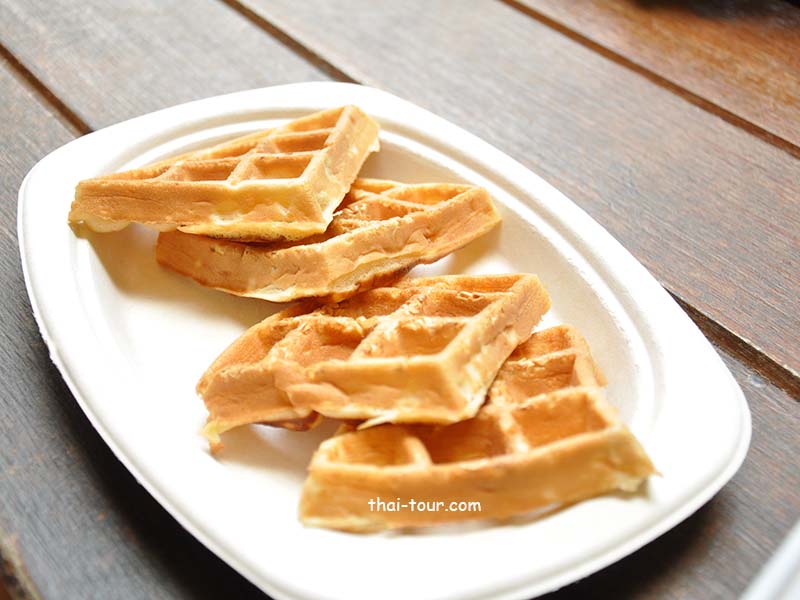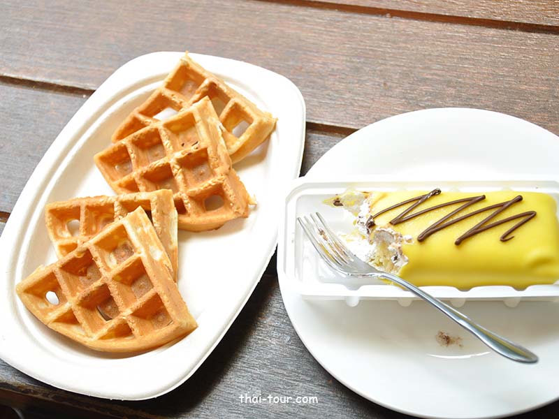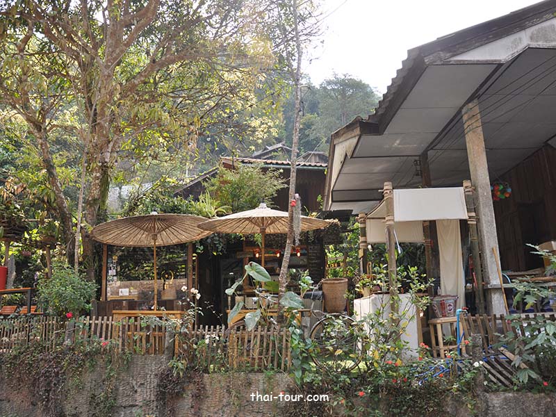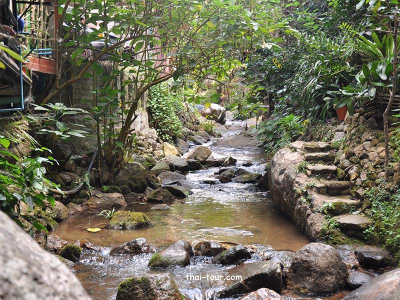 น้ำตกไหลลงมาเป็นลำธารผ่านตรงร้านขายอาหาร