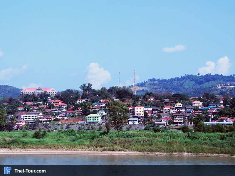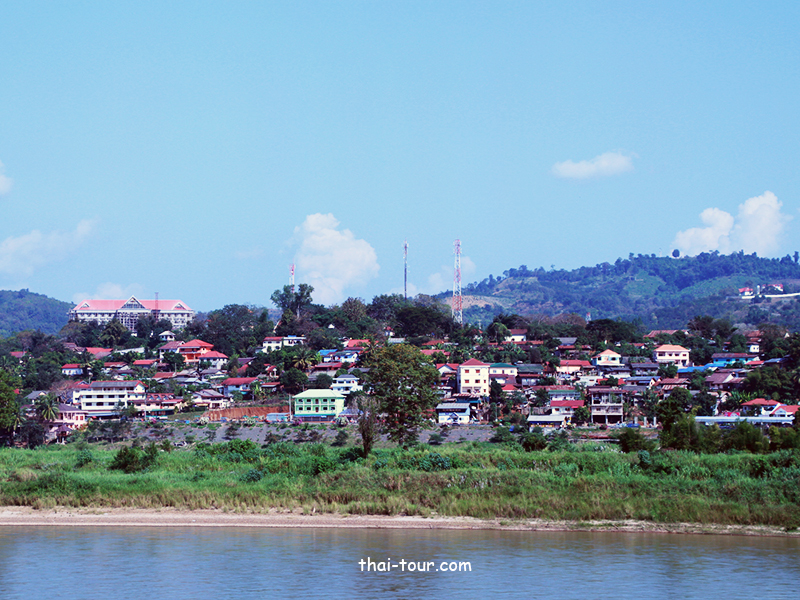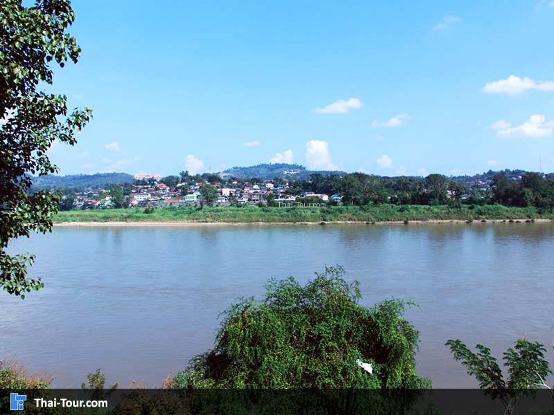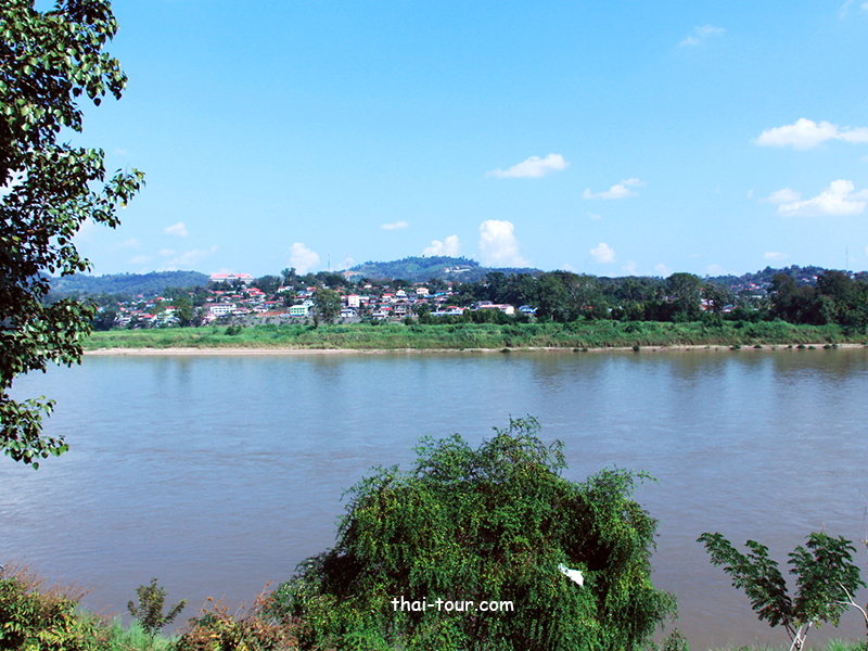 บรรยากาศของแม่น้ำโขงและชุมชนฝั่งตรงข้ามของวัดพระแก้ว เชียงของ