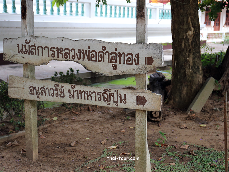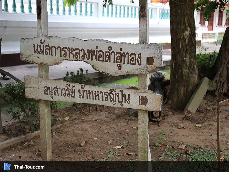 ป้ายบอกทางไปนมัสการหลวงพ่อดำอู่ทอง กับ อนุสาวรีย์ ม้าทหารญี่ปุ่น