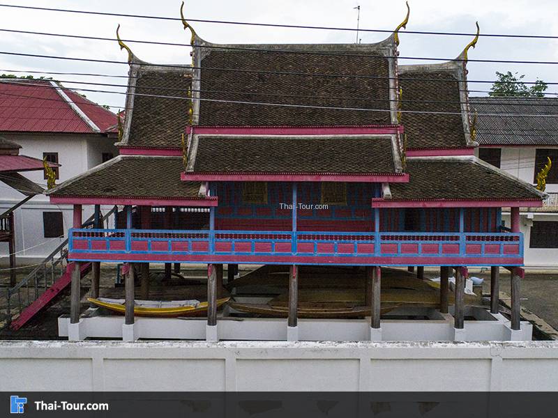 ตอนบนเป็นซี่ลูกกรงไม้กลึงเสากรอบประตูเป็นเสาหัวเม็ด ประตูหูข้าง เครื่องลำยองเป็นไม้จำหลัก หลังคาซ้อน 2 ชั้น มีปีกนก 1 ชั้น มุงกระเบื้องดินเผาใต้เชิงชาย และหน้าบันประดับไม้สลักลายรดน้ำ ฝาผนังด้านนอกทาสีลูกฟักด้วยสีแดง ขอบขาวตัวไม้เครื่องบันอื่นๆ ทาสีขาว ตัดเหลี่ยมสีแดง เสาลงพื้นสีขาวเขียนลายแดง หน้าบาน ประตูเข้าในหอไตรเป็นบานไม้ลงรักปิดทองลายพุ่มข้าว-บิณฑ์ และประจำยามก้านแย่ง อกเลาเป็นไม้จำหลักลายดอกพุดตานลูกฟัก เหนือประตูเป็นภาพนกข้างละตัว เหนือขึ้นไปเป็นภาพพระอาทิตย์ พระจันทร์ ในห้องสะกัดท้ายหอไตรเป็นที่เก็บพานตะลุ่ม และ ฐานพระพุทธรูปไม้จำหลักเป็นจำนวนมาก