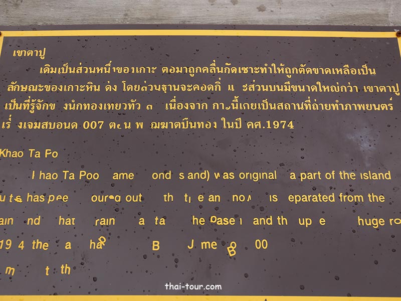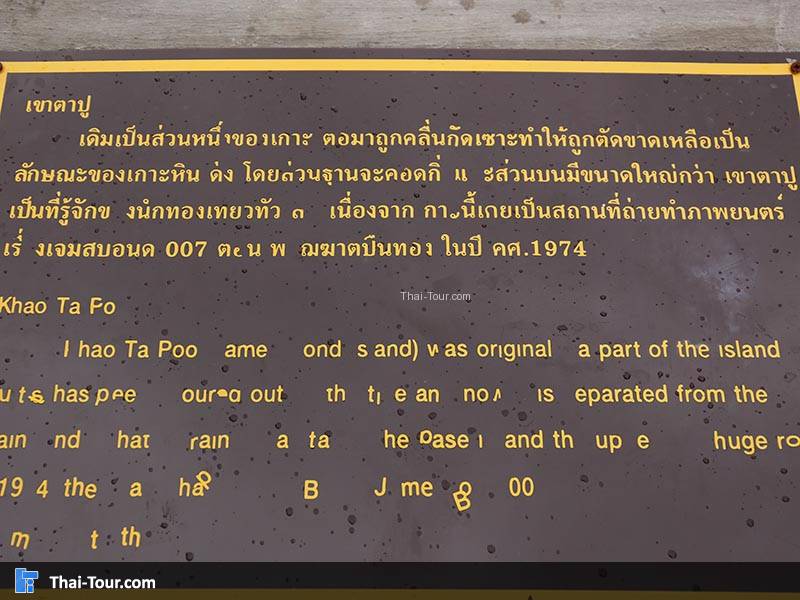 ลักษณะเป็นแท่งหินใหญ่มหึมาโดดเด่นปักอยู่ในทะเลบริเวณปากอ่าวพังงาใกล้ๆ กับเขาพิงกัน ซึ่งเมื่อมองจากระยะไกลแล้ว จะเห็นมีลักษณะคล้ายกับตะปูขนาดยักษ์ถูกตอกลึกลงไปในน้ำ อย่างไรก็ตาม เขาตะปูเป็นภูเขาที่มีอันตรายห้ามเข้าใกล้เนื่องจากส่วนที่จมอยู่ใต้ทะเลได้ถูกน้ำทะเลกัดเซาะ เป็นเวลานานนับล้านปี จึงสึกกร่อนและมีขนาดเล็กกว่าส่วนบน มากมายหลายเท่า จนมีความกลัวกันว่าอาจล้มลงมาในเวลาใดเวลาหนึ่งก็ได้ ทางราชการและเจ้าหน้าที่จากหน่วยงานที่เกี่ยวข้อง จึงได้ห้ามนักท่องเที่ยวล่องเรือเข้าไปดูใกล้ๆ โดยเด็ดขาด เนื่องจากเกรงว่าจะได้รับอันตรายดังกล่าว