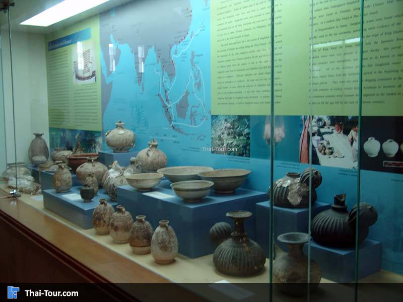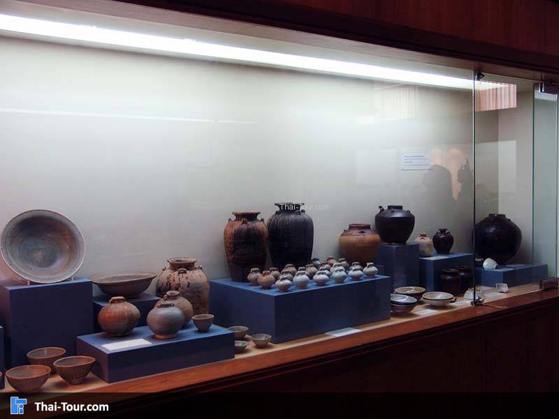 จัดแสดงเครื่องสังคโลก ซึ่งขุดค้นพบมากที่แหล่งโบราณคดี บ้านเกาะน้อย