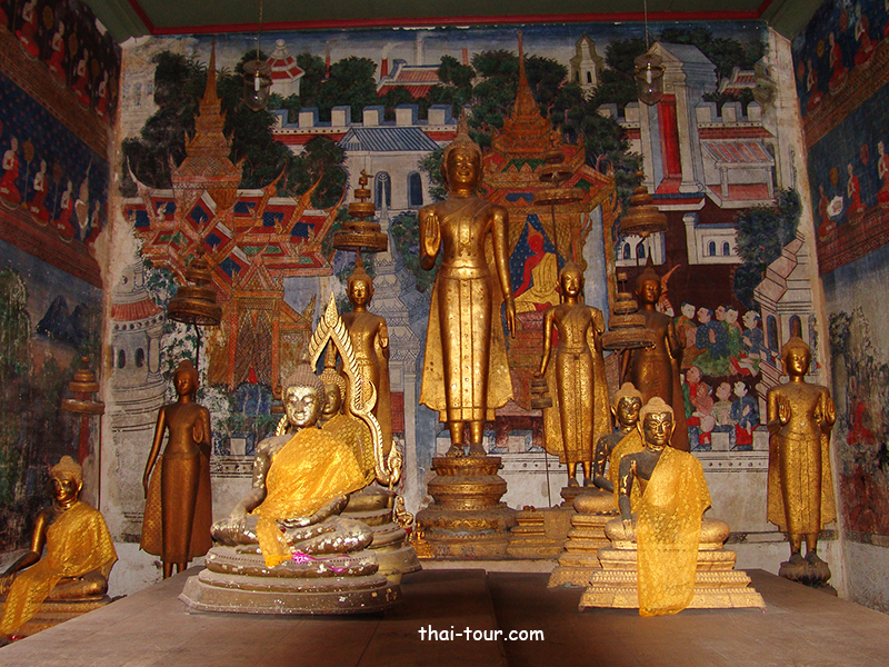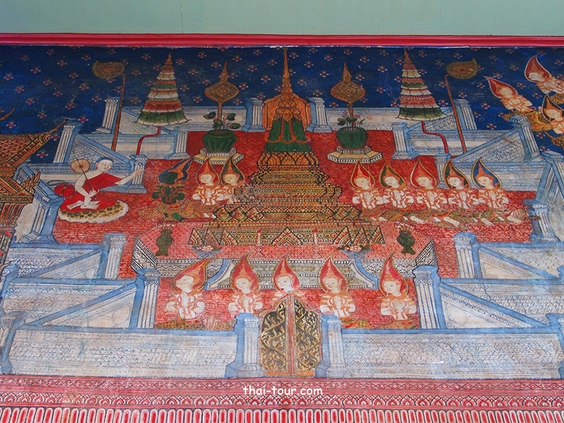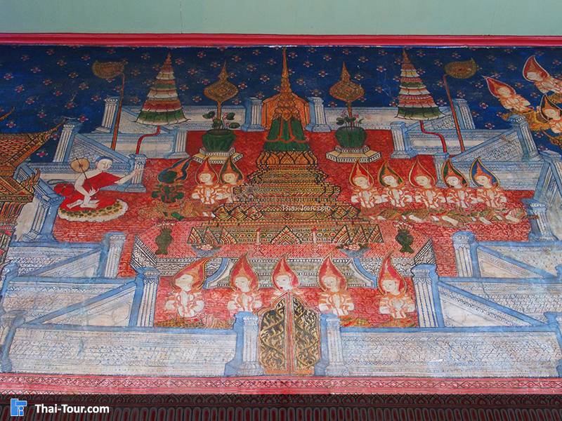 ภาพจิตรกรรมในวิหาร ภายในวิหารประดิษฐานพระประธานปางห้ามญาติ ซึ่งมีฉัตรห้าชั้นประดับอยู่เหนือเศียร ด้านซ้ายและขวาของพระประธานประดิษฐานพระพุทธรูปยืนทำด้วยไม้แก่นจันทน์สององค์ ที่ฝาผนังทั้งสี่ด้านมีภาพจิตรกรรม ที่นอกจากจะเขียนเป็นเรื่องพุทธประวัติแล้ว ยังมีภาพพระมาลัยซึ่งเป็นพระอรหันต์องค์หนึ่ง และภาพพระอสีติมหาสาวกซึ่งเป็นสาวกองค์สำคัญถึง 80 องค์ โดยช่างได้เขียนซ้อนกันเป็นสองแถว อีกองค์ประกอบหนึ่งที่น่าสนใจคือ ภาพพัดยศที่คั่นระหว่างมหาสาวก ชั้นบนเป็นพัดยศทรงดอกพุดตาน ชั้นล่างเป็นพัดยศทรงหน้านาง เขียนบนพื้นสีม่วงที่มีลายดอกไม้ร่วงอันสวยงาม มีภาพที่น่าชมอีกภาพหนึ่ง เป็นภาพพระอสุภกรรมฐาน คือการที่พระสงฆ์พิจารณาซากศพในสภาพต่างๆ