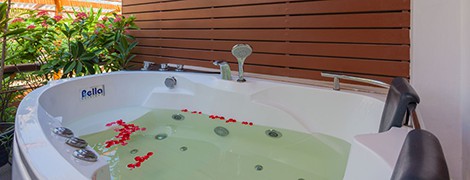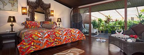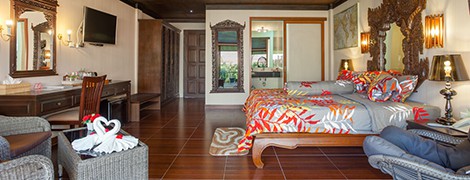 ที่พักล้อมรอบไปด้วยต้นปาล์มและพืชพันธุ์เขียวชอุ่มให้บริการห้องพักพร้อมเฟอร์นิเจอร์หวาย แต่ละห้องมีโทรทัศน์จอแบนระบบช่องสัญญาณดาวเทียมขนาด 42 นิ้ว โต๊ะทำงาน มินิบาร์ และห้องน้ำในตัว สิ่งอำนวยความสะดวก